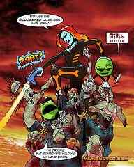Ms. Monster: Well, we like to say it was a case of accidental incantation…or something like that…you can read the Origin comic to find out the details of where the melons came from. Tat lost his eye when Tit was running with charmed scissors and dodging banana peels and, well, he slipped. You can see the scene yourself on our first DVD. It is finally becoming less of a sore subject around here – especially now that we are figuring out how to use the portal in Tat’s eye socket to jump dimensions. Awesome.