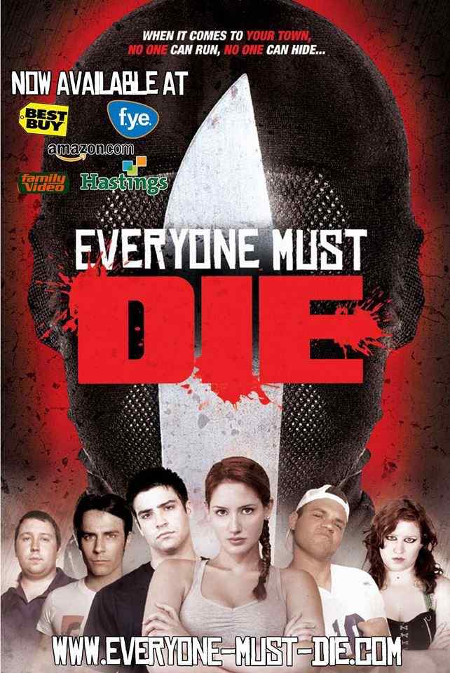 Everyone Must Die! is a microbudget indie slasher flick. The plot follows, “A pattern of similar killings that occure, leaving small towns aghast with grief and suspicion. When the massacre left Kyle’s sister dead, he vowed to solve the mystery behind the gruesome pattern of slaughter and find out where this seemingly death-proof killer will strike next. A tale of gore spreads from town to town, person to person, and kill to kill, leaving nobody safe because after all… EVERYONE MUST DIE!”