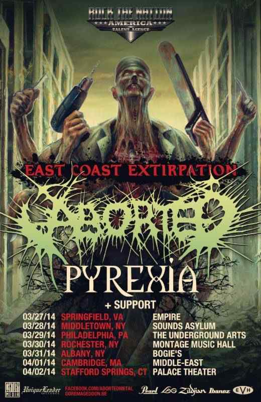 Sven had to say the following: “East coast beware, since several of you have demanded east coast shows, we give you some! Also, the reason we are doing this has nothing to do with the fact that we absolutely want to get fat on philly cheese steaks or New York pizza. Also, we are thrilled to have New Yorks legendary Pyrexia coming along with us to give you many shit tsunamis through the power of brutal death metal. in all seriousness, we are very excited to play this week of exclusive headline dates before the release of our new album and we better see some familiar faces there! Grind!”